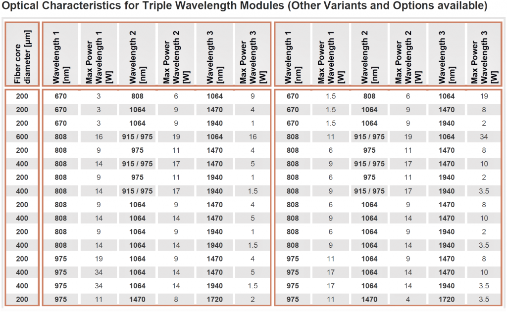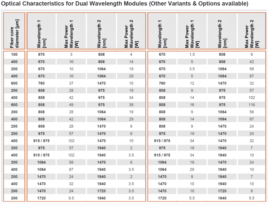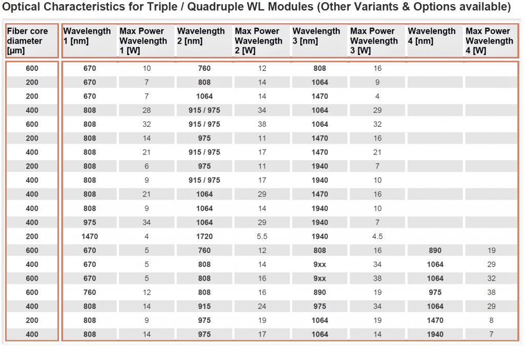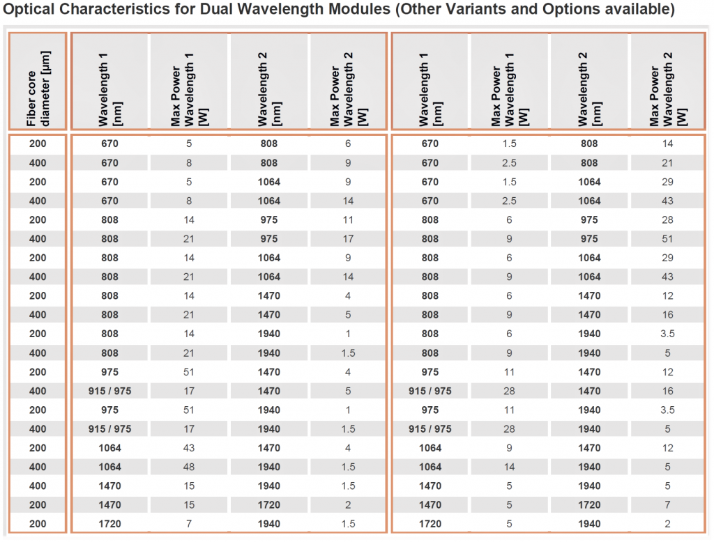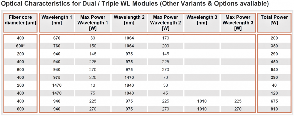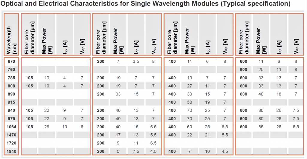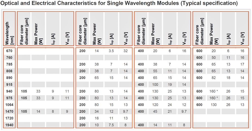 dependent on chosen wavelength and fiber core diameter - 200 / 400 / 600 μm