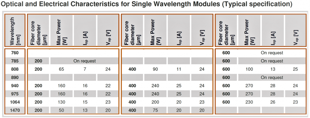dependent on chosen wavelength and fiber core diameter - 200 / 400 / 600 μm