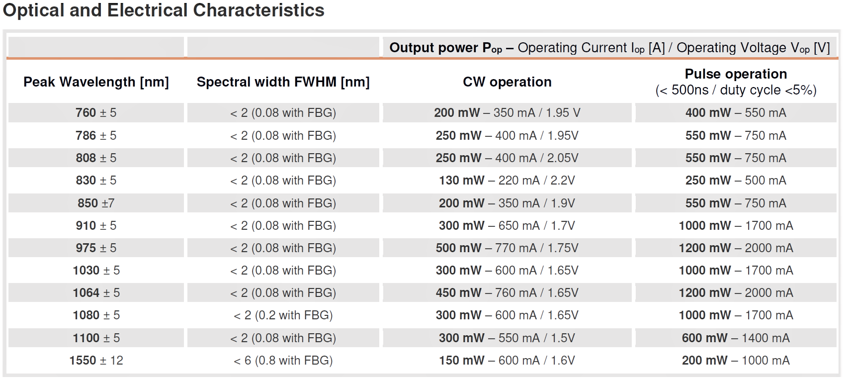 - 760 / 786 / 808 / 830 / 850 / 910 / 975 / 1030 / 1064 / 1080 / 1100 / 1550 nm