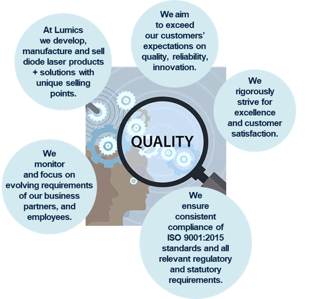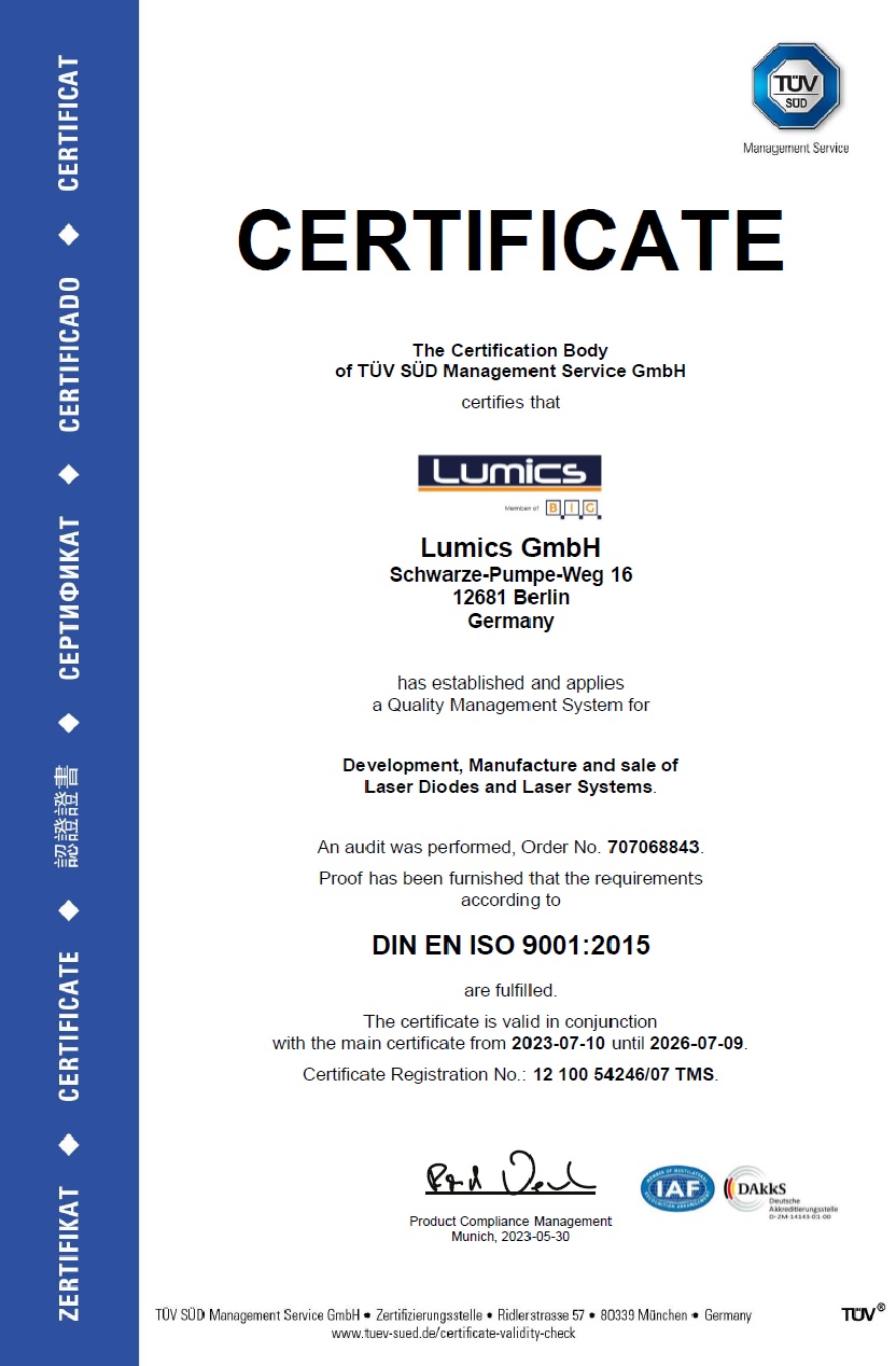 Since as early as 2006 the quality standards at Lumics have been certified according to DIN EN ISO 9001 at regular intervals. Our ISO certification does not cover only production but includes also development and sales, and it therefore plays a key role in the continuous optimization of our business processes.